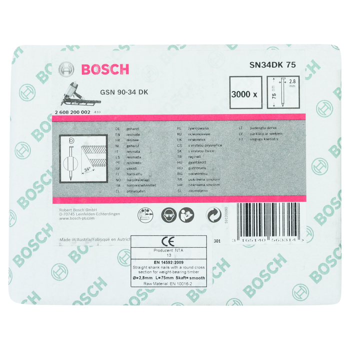 BOSCH Set 3000 cuie lucioase netede, cu cap D, SN34DK 75G, 34°, 2.8x7.0x75 mm pentru GSN 90-34 DK