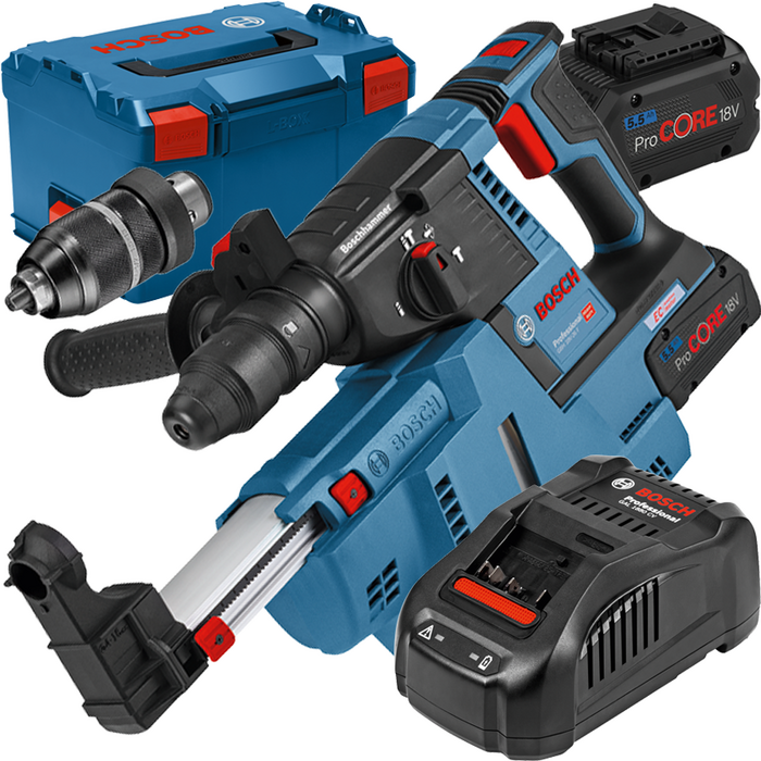 Ciocan rotopercutor brushless, cu 2 acumulatori Li-Ion, 5.5Ah, 2.6J + GDE 18V-16 Sistem de extractie a prafului + L-BOXX