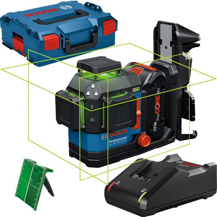 Nivela laser cu linii verzi (35 m) cu Bluetooth + Suport + 1 acumulator Li-Ion 18V, 4Ah + Incarcator GAL18V-40 + L-BOXX