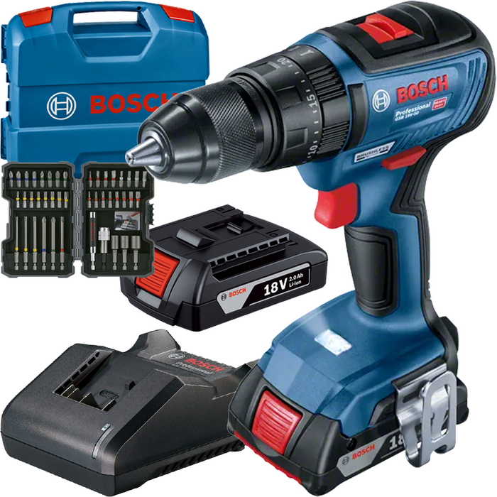 Masina de gaurit cu percutie brushless cu 2 acumulatori Li-Ion, 2Ah, 50Nm, cu incarcator de 2Ah GAL18V-20 + Valiza L-CASE + Set 43 accesorii