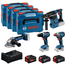 Ciocan rotopercutor (GBH 18V-26), 2.6J + Masina de gaurit si insurubat (GSR 18V-65), 63Nm + Surublenita cu impact (GDX 18V-285), 285Nm + Polizor unghiular (GWS 18V-11), 125 mm + 2x accu, 18V, 5 Ah + 1x accu Expert 5.5 Ah + Incarcator + 4x L-boxx
