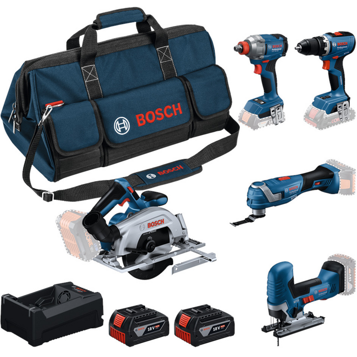 GSR 18V-65 + GDX 18V-285 + GKS 18V-57-2 + GOP 18V-34 + GST 18V-125 S + 2x 5.0Ah + GAL 12V-18V-80 + Geanta textil
