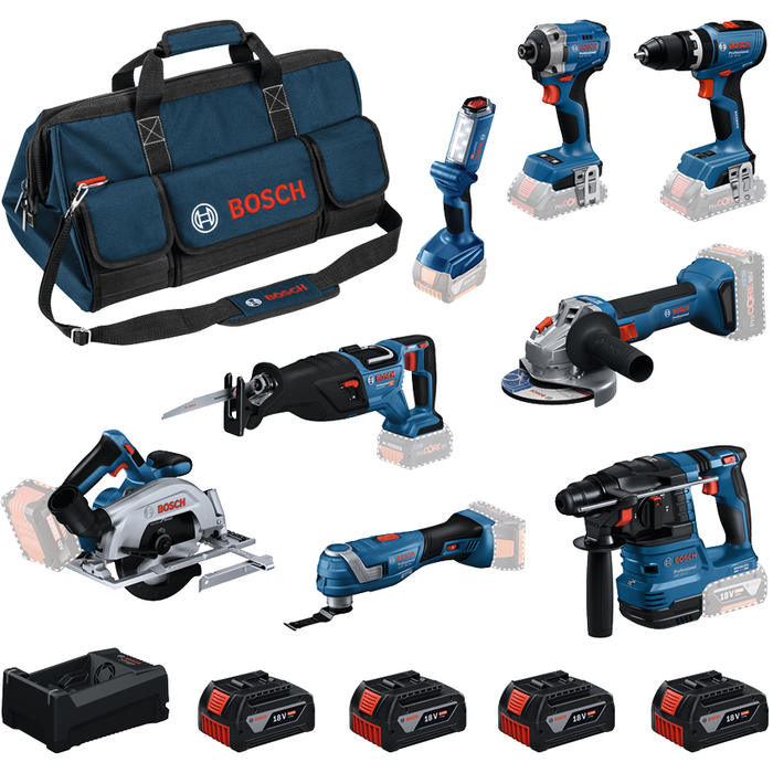GBH 18V-22 + GLI 18V-300 + GOP 18V-34 + GSB 18V-65 + GWS 18V-8 + GDR 18V-215 + GKS 18V-57-2 + GSA 18V-28 + 4x GBA 18V 5.0Ah + GAL + Geanta textil