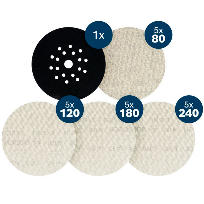 BOSCH Set 20 foi EXPERT slefuire tavan/pereti (slefuire fara praf) 225 mm, mixte R80/120/180/240 + Piesa intermediara pentru protectie talpa