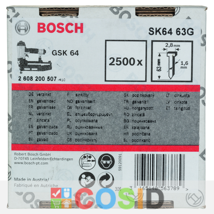 BOSCH Set 2500 cuie zincate, cu cap T, SK64 63G, 1.6x2.8x63 mm pentru GSK 64