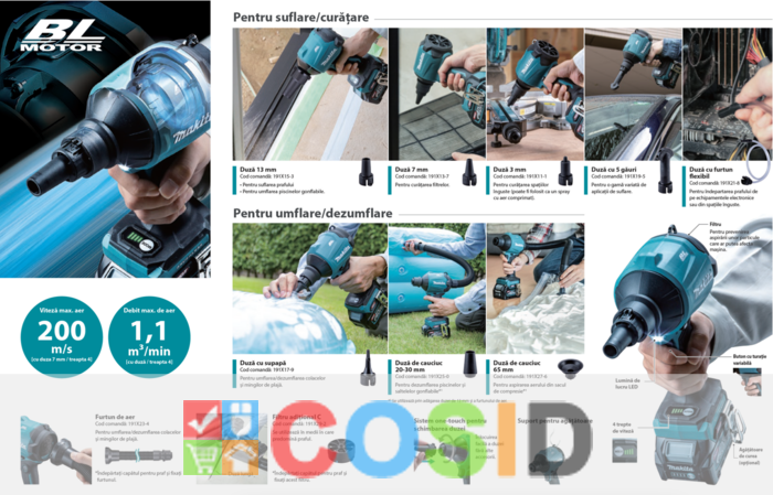 Suflantă puternică cu baterie cu multe aplicații datorită celor 5 atașamente diferite furnizate standard.