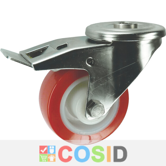 These stainless-steel castors, designed for use in corrosive environments, offer exceptional durability and chemical resistance, making them ideal for demanding applications such as food processing, bakeries, and autoclaves. The wheels feature a hard-wearing polyurethane tread bonded to a nylon core, ensuring smooth and quiet operation, even under heavy loads. With temperature and chemical resistance, these castors are built to withstand tough industrial environments. Features and Benefits • 80kg to 240kg load capacity depending on wheel size and design • Corrosion-resistant stainless steel with chemical-resistant polyurethane tyres • Nylon core with polyurethane tread provides a smooth, durable performance • Braked design allows for secure, stationary positioning • Braked swivel offers enhanced safety and control • Top plate or bolt hole mounting available for easy installation