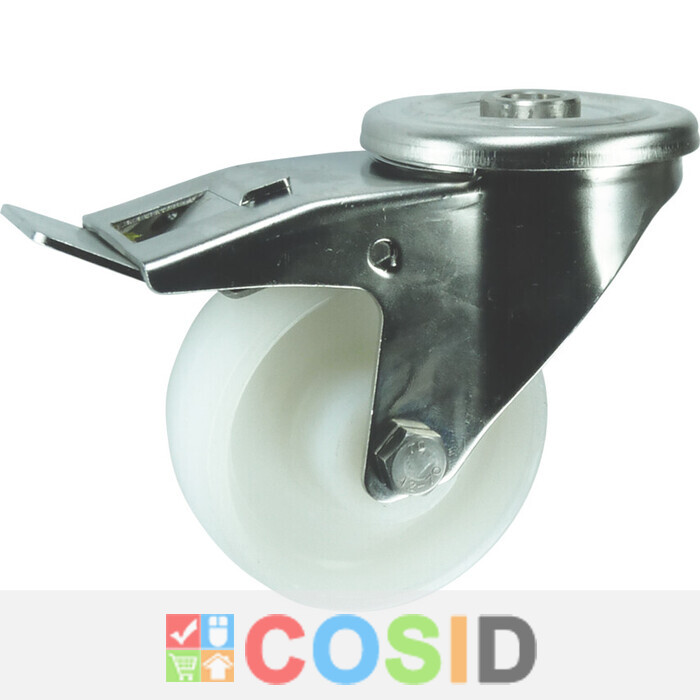 A range of stainless-steel castors designed for use in corrosive conditions. These popular nylon-wheeled stainless-steel castors are ideal for washdown environments and are widely used in food processing, catering, clean rooms, medical sectors, laboratories, and schools. Features and Benefits • White castors offer a clean, hygienic appearance • Nylon wheels provide durability and smooth movement • Nylon tyres for resistance to wear and tear • Roller bearing for enhanced manoeuvrability • Suitable for machinery, trolleys, and industrial equipment • Washdown-safe and anti-corrosive for long-lasting performance in demanding environments