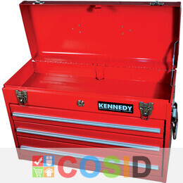 Din otel greu, sudata in intregime. Vopsita cu pudra epoxidica pe ambele parti, rezistenta la coroziune. Clame cu deschidere rapida, balamale pentru lacat si manere de transport din material textil. Balamalele continue pe toata suprafata asigura rigiditate si rezistenta, manipulare usoara si un plus de siguranta. Trei sertare pe toata lungimea cutiei cu manere rigide cu margini din aluminiu. Unitate blocabila cu maner pe capac si maner de transport la fiecare capat. Cand este coborat, capacul blocheaza in mod automat toate sertarele inchise, pentru a preveni deschiderea. inaltime: 340 mm, adancime: 215 mm, latime: 520 mm. Dimensiunile sertarelor: 2 sertare: 460 x 180 x 55 mm, 1 sertar: 460 x 180 x 75 mm.Grupa de produs: 594
