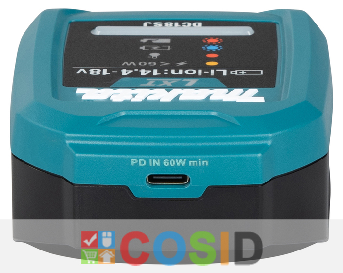Încărcător USB PD pentru baterii LXT de 14,4 V și 18 V. Timpul de încărcare depinde de puterea de intrare PD (60/80/100 W) și de capacitatea bateriei. Un indicator LED informează utilizatorul despre starea curentă de încărcare. Cablul USB Type-C dintre sursa de alimentare și încărcător are o lungime de 1 metru.