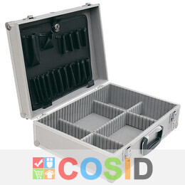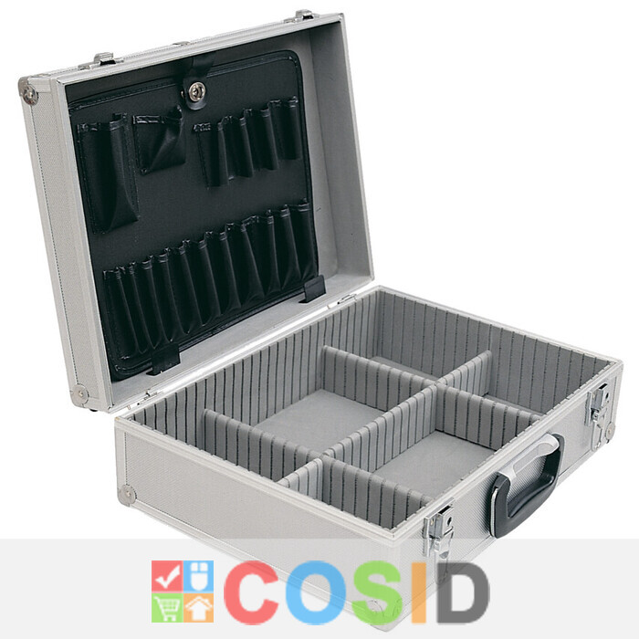 Geanta de mare rezistenta pentru depozitarea sculelor, ideala pentru inginerul de service aflat in miscare. Asigura depozitarea unui numar mare de scule si are aspectul profesional al unei serviete. Din aluminiu argintiu cu margini si colturi ranforsate. Compartimentul interior de la baza este echipat cu divizori reglabili, pentru alegerea dimensiunilor. Placa rigida pentru instrumente detasabila depozitata in capacul de inchidere cu 17 buzunare de diverse dimensiuni. Cu maner fix si doua incuietori si chei de siguranta.Grupa de produs: 593