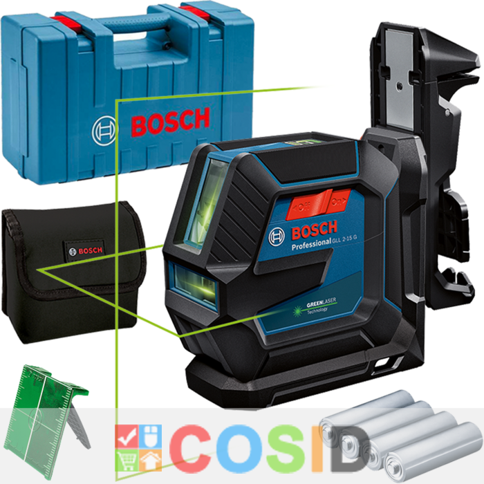 BOSCH Professional GLL 2-15 G + LB 10 + DK 10 Nivela laser cu linii verzi (15 m) + Suport universal + Clema de prindere pe tavan + Valiza