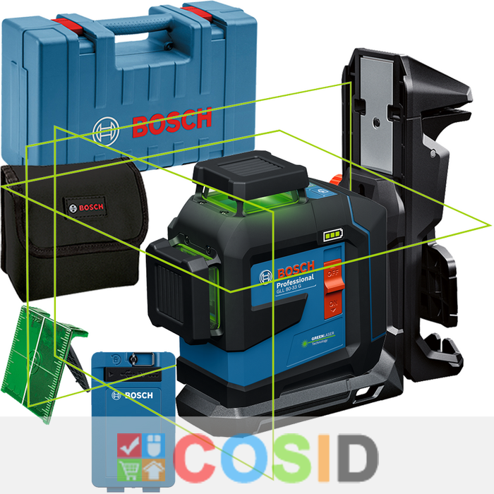 BOSCH Professional GLL 80-33 G + LB 10 + DK 20 Nivela laser cu linii verzi (30 m) + Suport + Clema + Acumulator 3.7V, 3Ah + Valiza