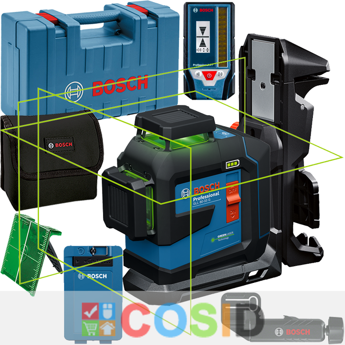 BOSCH Professional GLL 80-33 G + LB 10 + DK 20 + LR 7 Nivela laser cu linii verzi (30 m) + Receptor + Suport + Clema + Acumulator 3.7V, 3Ah + Valiza