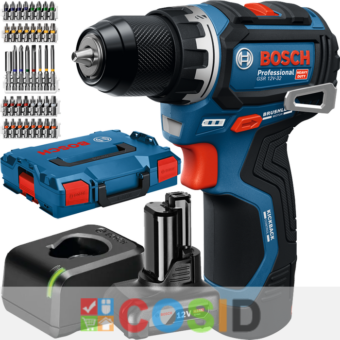 BOSCH Professional GSR 12V-32 Masina de gaurit si insurubat brushless cu 2 acumulatori Li-Ion unul de 2Ah si unul de 4Ah, 32Nm + Set 40 biti + Valiza L-BOXX