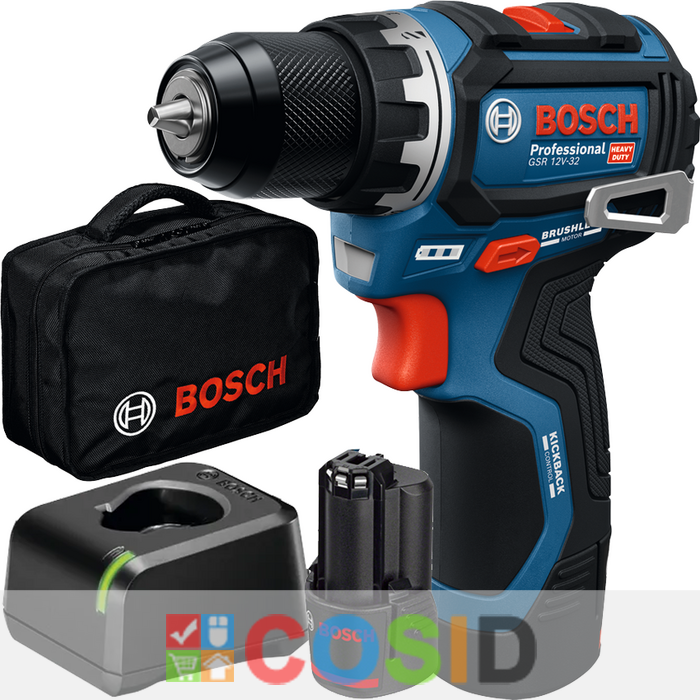 BOSCH Professional GSR 12V-32 Masina de gaurit si insurubat brushless cu 2 acumulatori Li-Ion, 2Ah, 32Nm + Geanta textil
