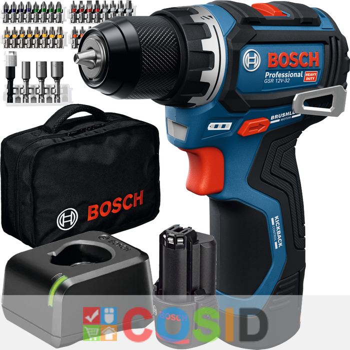 BOSCH Professional GSR 12V-32 Masina de gaurit si insurubat brushless cu 2 acumulatori Li-Ion, 2Ah, 32Nm + Set 36 accesorii + Geanta textil