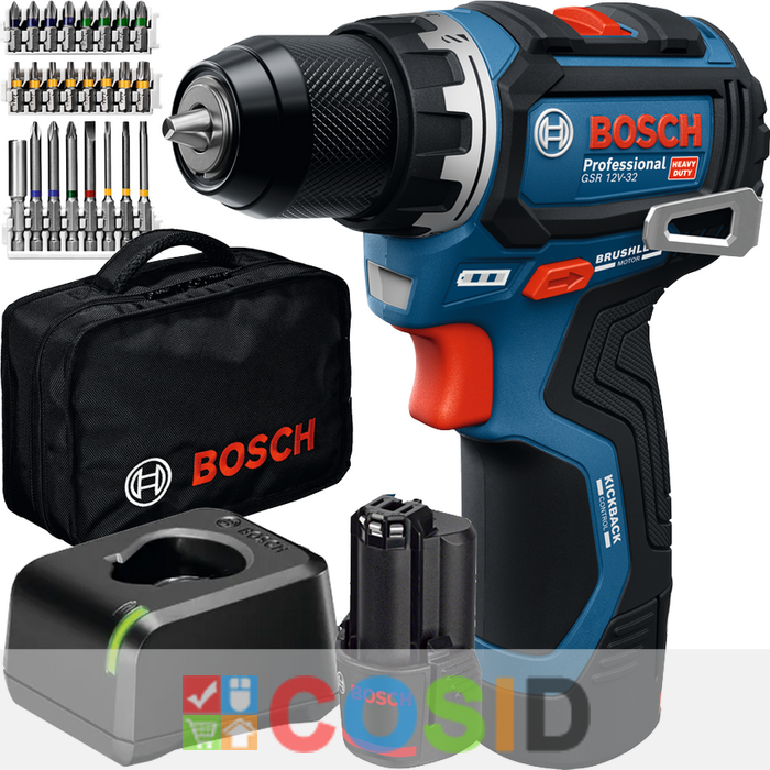 BOSCH Professional GSR 12V-32 Masina de gaurit si insurubat brushless cu 2 acumulatori Li-Ion, 2Ah, 32Nm + Set 24 accesorii + Geanta textil