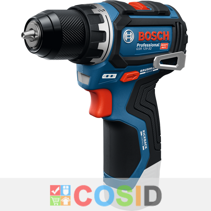 Informaţii adiţionale: GSR 12V-32 Professional este dotată cu Advanced KickBack Control, un motor fără perii, o mandrină metalică robustă, o lampă de lucru puternică și o clemă de prindere la centură.
