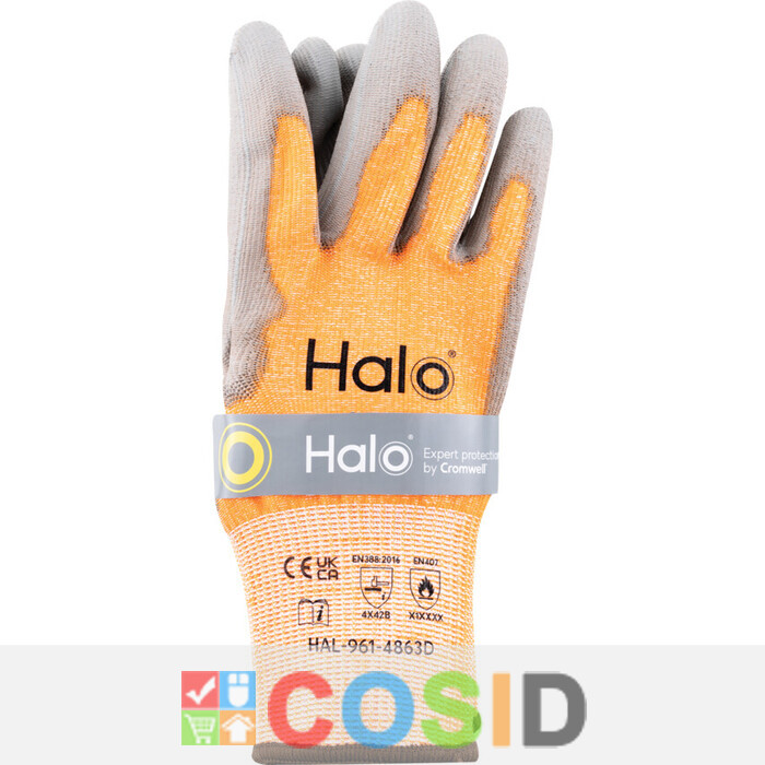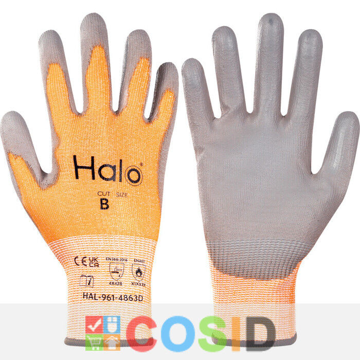 These Seamless Nylon PU Palm Coated Cut B Gloves from the Halo® PPE range have been designed with comfort and performance in mind. Halo® products are manufactured to suit a diverse workforce, and ensure everyone is protected. By choosing Halo® you are supporting worthwhile charities including Mind for Mental Health and The Diversity Trust. Where possible, single-use plastic bags have been removed from Halo® packaging to reduce our impact on landfill and on the environment. Designed for handling dry components that could produce a cut risk, these seamless nylon and polyurethane gloves are available in a wide range of sizes to ensure that everyone is protected. Features and Benefits • Comfortable 13 gauge cut B resistant liner effectively protects against cuts • Polyurethane (PU) coated palm increases grip and dexterity and lets you handle dry components that could pose a cut risk • HPPE cut resistant material protects against cutting injuries • Knit wrist cuffs prevent the ingress of dirt and dust into the glove to enhance wearer comfort • Seamless design reduces potential irritation to the skin • Available in a range of sizes allowing you to find the size that's the best fit for you Standards • Halo® products are BSI tested • EN 388:2016 4.X.4.2.B. • EN 407:2004 X1XXXX • EN 420:2003+A1:2009