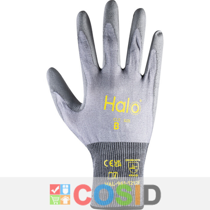 These Cut B PU Palm Coated Gloves from the Halo® PPE range have been designed with comfort and performance in mind. Halo® products are manufactured to suit a diverse workforce, and ensure everyone is protected. By choosing Halo® you are supporting worthwhile charities including Mind for Mental Health and The Diversity Trust. Where possible, single-use plastic bags have been removed from Halo® packaging to reduce our impact on landfill and on the environment. Available in a variety of sizes to suit your needs, these 18 gauge cut B resistant gloves are designed to keep you safe from cutting injuries when handling potentially dangerous or hazardous objects. Features and Benefits • 18 gauge cut B resistant liner allows for excellent dexterity and protection as well as comfort • Polyurethane (PU) coated palm allows you to effectively grip dry, damp, oily and greasy components and is extremely durable • The HPPE/fibreglass cut resistant material protects against cutting injuries • Elasticated cuffs protect against the ingress of dirt and debris • Design ensures optimum dexterity, conformability and comfortability • Available in various sizes to suit your needs Standards • Halo® products are BSI tested • EN 388:2016 4X42B (plus add shield) • EN 420:2003+A1:2009