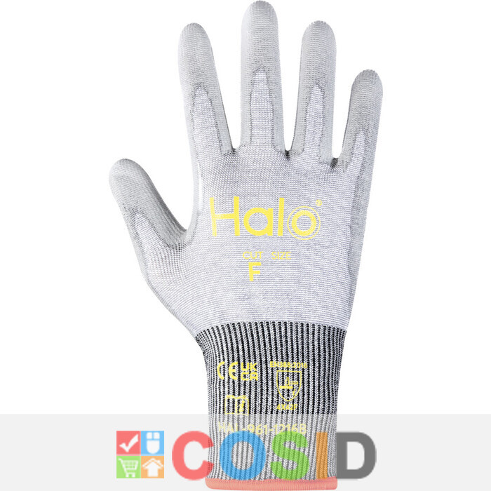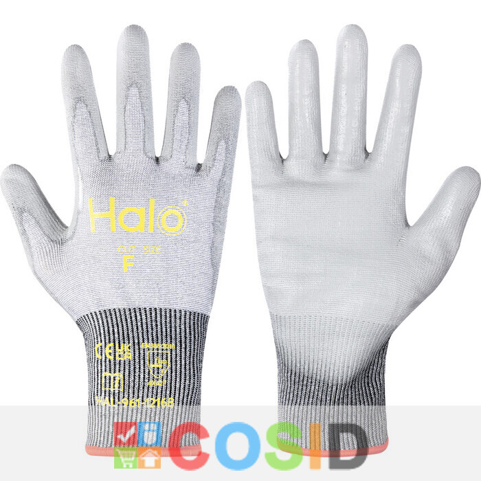 These Cut F PU Coated Gloves from the Halo® PPE range have been designed with comfort and performance in mind. Halo® products are manufactured to suit a diverse workforce, and ensure everyone is protected. By choosing Halo® you are supporting worthwhile charities including Mind for Mental Health and The Diversity Trust. Where possible, single-use plastic bags have been removed from Halo® packaging to reduce our impact on landfill and on the environment. Available in a wide range of sizes, these cut F PU palm coated cut resistant gloves are designed to protect the wearer from cutting injuries when handling potentially dangerous or sharp objects and materials. Features and Benefits • 18 gauge cut F resistant liner allows for excellent dexterity and protection as well as comfort • Polyurethane (PU) coated palm allows you to effectively grip dry, damp, oily and greasy components and is extremely durable • A HPPE cut resistant material offers protection against cutting injuries • Elasticated cuffs help to prevent the ingress of dirt and debris into the gloves • Fingertips are touchscreen compatible, meaning you don't have to remove the glove to operate phones, tablets or other touchscreen devices • Design ensures optimum dexterity, conformability and comfortability • Available in various sizes to suit your needs Standards • Halo® products are BSI tested • EN 388:2016 4.X.4.2.F • EN 420:2003+A1:2009
