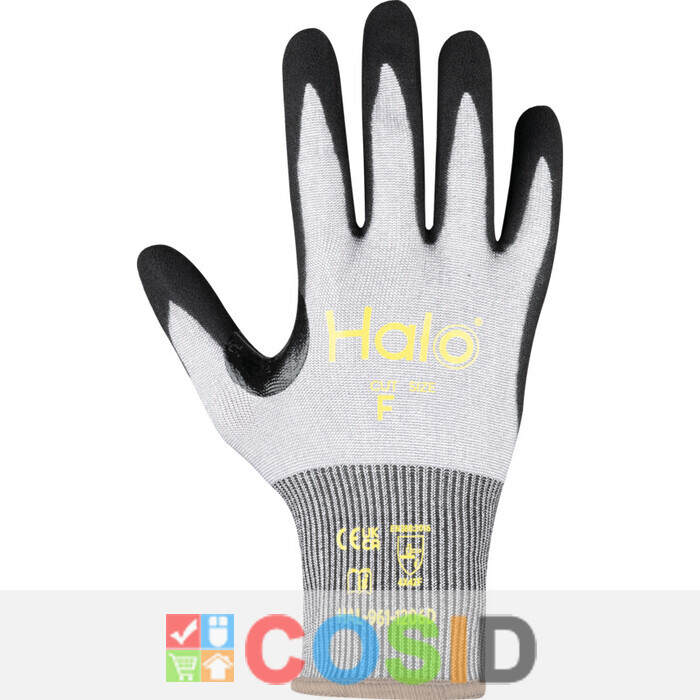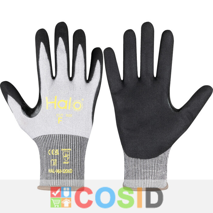 These Cut F Sandy Nitrile Coated Gloves from the Halo® PPE range have been designed with comfort and performance in mind. Halo® products are manufactured to suit a diverse workforce, and ensure everyone is protected. By choosing Halo® you are supporting worthwhile charities including Mind for Mental Health and The Diversity Trust. Where possible, single-use plastic bags have been removed from Halo® packaging to reduce our impact on landfill and on the environment. Available in a wide range of sizes, these 18 gauge cut F liner gloves possess a sandy nitrile palm coating for excellent grip when handling oily or greasy components as well as protecting against cutting injuries. Features and Benefits • 18 gauge cut F resistant liner allows for excellent dexterity and protection as well as comfort • Sandy nitrile coated palm allows for excellent grip even when handling great or oily components • The HPPE cut resistant material protects against cutting injuries • Elasticated cuffs protect against the ingress of dirt and debris • Touchscreen compatible so you do not have to remove the glove when operating phones, tablets and other touchscreen devices • Additional thumb crotch protection • Design ensures optimum dexterity, conformability and comfortability • Available in various sizes to suit your needs Standards • Halo® products are BSI tested • EN 388:2016 4.X.4.2.F • EN 420:2003+A1:2009