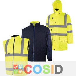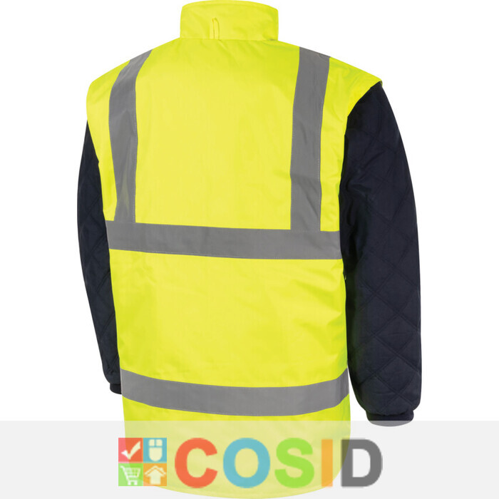 These reversible 2 Band & Brace 5-in-1 Hi-Vis Coats from the Halo® PPE range have been designed with comfort and performance in mind. Halo® products are manufactured to suit a diverse workforce, and ensure everyone is protected. By choosing Halo® you are supporting worthwhile charities including Mind for Mental Health and The Diversity Trust. Where possible, single-use plastic bags have been removed from Halo® packaging to reduce our impact on landfill and on the environment. This convenient and extremely versatile reversible multi-function coat system delivers wear for all seasons. An outer waterproof, high visibility jacket is insulated by a detachable inner jacket for cold, dry weather. For warmer days, this jacket has a detachable hood and sleeves to create a body warmer. Ideal for tradesmen and outdoor workers, the multiple wear options reduce the need for multiple coats and suit any weather conditions. Features and Benefits • Adjustable Hook-n-Loop cuff straps for a secure and comfortable fit • Fleece collar keeps the neck warm and insulates against the cold • Reversible design allows for the choice of a high visibility jacket or body warmer, or a navy fleece high visibility jacket or body warmer • Both the inner and outer are manufactured from polyester for durability and product resilience • 2 Band & Brace reflective tape design on the outer ensures the wearer is visible in low-light conditions • Inner layer/body warmer possesses visibility banding to meet EN ISO 20471:2013 class 3/2 • Two-way zip with a stud storm flap closure delivers added protection in harsh conditions, with the zip also acting as a closure and attachment to the inner layer • Inner layer features elasticated cuffs and removable zipped sleeves to create a body warmer • Three external pockets for storage of personal effects, including a mobile phone pocket • Inner layer has three external pockets including a phone pocket • Available in either yellow or orange as well as a range of sizes to suit your needs Standards • Halo® products are BSI tested • CE Certified • EN ISO 20471:2013 Class 2 and 3 • EN 343:1993 Class 3 • RIS-TOM-3279 (Orange Only) Approvals • Directive 89/686/EEC