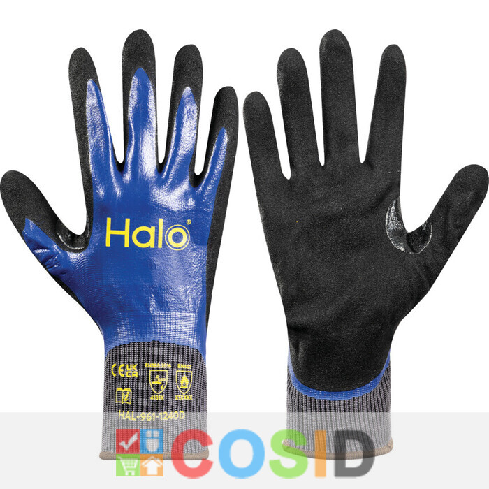 These Double Nitrile Coated Gloves from the Halo® PPE range have been designed with comfort and performance in mind. Halo® products are manufactured to suit a diverse workforce, and ensure everyone is protected. By choosing Halo® you are supporting worthwhile charities including Mind for Mental Health and The Diversity Trust. Where possible, single-use plastic bags have been removed from Halo® packaging to reduce our impact on landfill and on the environment. Available in a wide range of sizes, these double nitrile coated gloves are suited for protecting hands when handling potentially hazardous objects or materials. Features and Benefits • 15 gauge liner for comfort and protection • Fully coated with nitrile as well as a foam nitrile layer additionally coating the palm for excellent dexterity when handling heavily oily or greasy products • Elasticated cuff secures the gloves in place and prevents dirt and debris from ingressing • Available in a range of sizes to ensure you find the best fit Standards • Halo® products are BSI tested • EN 388:2016 4131X (plus add shield) • EN 407:2004 X1XXXX (plus add shield) • EN 420:2003+A1:2009