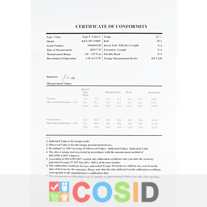 These Digital Torque Wrenches are state-of-the-art tools designed to deliver precision, control, and convenience, ensuring high-quality results in various industries. Features and Benefits • Offers torque, unit, and mode settings, along with online calibration, making it adaptable to multiple applications • Operates in both clockwise and anticlockwise directions, increasing flexibility for different tasks • Clear LCD shows measurements in N-m, ft-lb, in-lb, and kg-cm, allowing easy reading and reduced errors • Real-time feedback provides torque confirmation with a buzzer and LED indicators, ensuring the user knows when the target torque is achieved • Features green and red LED lights to warn users as torque approaches and reaches the target, preventing over-tightening • Simple setup enables quick adjustments for specific applications, saving time and increasing efficiency Standards • ISO 9001 • CE • EN 61000I