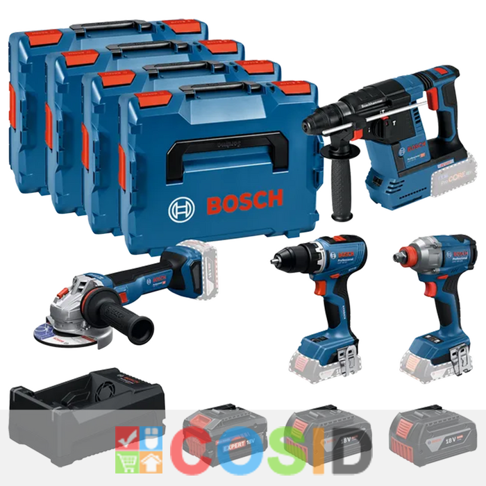 BOSCH Professional Kit 4 scule 18V Ciocan rotopercutor (GBH 18V-26), 2.6J + Masina de gaurit si insurubat (GSR 18V-65), 63Nm + Surublenita cu impact (GDX 18V-285), 285Nm + Polizor unghiular (GWS 18V-11), 125 mm + 2x accu, 18V, 5 Ah + 1x accu Expert 5.5 Ah + Incarcator + 4x L-boxx