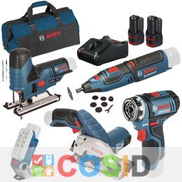 BOSCH Professional KIT 5 scule 12V (GRO 12V-35/GLI 12V-330/GST 12V-70/GKS 12V-26/GSR 12V-15 FC) cu 2 acumulatori Li-Ion, 3Ah + Incarcator rapid de 4Ah GAL12V-40 + Geanta textil