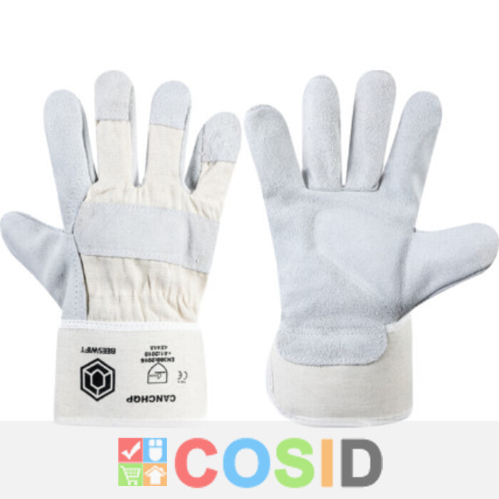 Cu piele de vacă pentru palme şi protejarea încheieturilor şi vârfurilor degetelor. Palmă tivită cu nailon, spate din bumbac. Manşete de siguranţă de 2” cu protecţie arterială. Spate elastic.