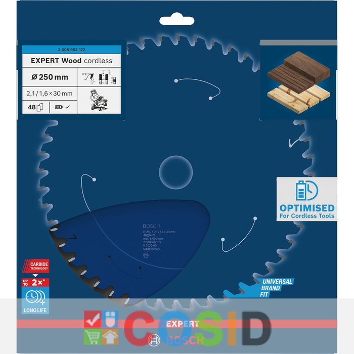 BOSCH Pânză de fierăstrău circular EXPERT Wood cordless, 250 x 2,1/1,6 x 30 mm, T48