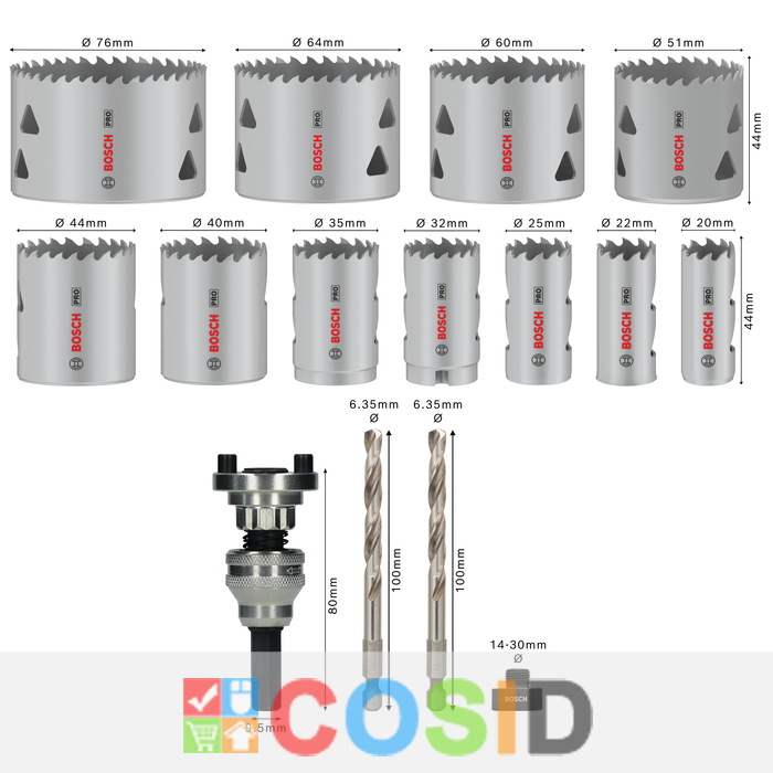 BOSCH Set 11 carote PRO Multi Material PC Plus 20/22/25/32/35/40/44/51/60/64/76 mm
