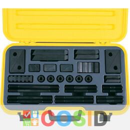 Proiectat pentru a salva timp si a rezolva majoritatea problemelor de prindere cu T-slot. Toate componentele manufacturatdin otel carbon nealiat grad S45C (JIS)/CK45 (DIN) Calite conform HRC 28 - 32 cu un finish de fosfat de mangan. Livrat intr-o cutie solida de plastic. Setul contine: Bolturi (4x): 75, 100, 125, 150, 175 si 200 mm lung. Piulita blocare (4x): 28, 35 si 98 mm mare. Step Cleme (2x): 64, 100 si 150 mm lung. Piulite (4x), Flansa (6x), T- slot (6x).Grupa de produs: 425