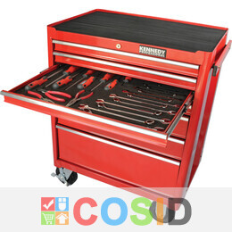 Din otel greu cu panouri laterale din pereti dubli si imbinari sudate pentru mai multa rezistenta. Acoperit cu strat rezistent de pulbere epoxidica. Sertare cu deschidere completa pentru acces sporit. Glisiere sertare pe rulmenti, cu eliberare rapida si rulare usoara cu sine duble la sertarul inferior. Cu covoras superior si captuseala sertare. Blocare completa. Roti foarte rezistente 125x 50 mm, prevazute cu doua frane. Dimensiuni totale: 890 x 690 x 460 mm. Fiecare roata poate suporta o sarcina permanenta de 100 kg. Sarcinile sertarelor trebuie distribuite uniform. Sertare (W x D x H): 4@ 590 x 410 x 50 mm. 2@ 590 x 410 x 100 mm. 1@ 590 x 410 x 200 mm. Trusa cu 25 de piese cu dulap mobil profesional TCC025 Clesti profesionali 1 cleste cu cioc lung 1 cleste cu taiere diagonala 160 mm 1 cleste combinat 160 mm Chei combinate profesionale metrice: 6, 7, 8, 9, 10, 11, 12, 13, 14, 15, 16, 17, 18 si 19 mm surubelnite Pro-Torq in cruce: nr. 2 x scurte, nr. 2 x 100 mm Pozidriv(r): nr.1 x 75, nr.2 x 100, nr.3 x 150 mm Cu cap drept: 6.3 x 150, 8,0 x 200 mm. Paralele: 5.0 x 150 mm.Grupa de produs: 595