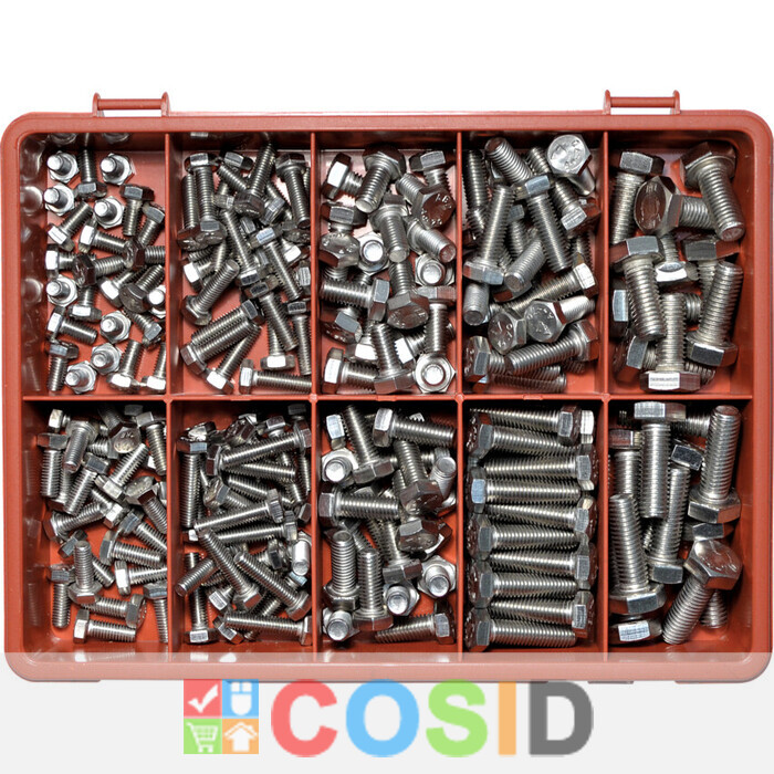 Kit suruburi A4 din otel inoxidabil cu cap metric HEX Contine: M6 x 12 - x25, M6 x 16 - x25, M6 x 20 - x25, M6 x 25 - x25, M8 x 16 - x20, M8 x 20 - x20, M8 x 25 - x20, M8 x 30 - x20, M10 x 25 - x10 si M10 x 30 - x10 mm. Cantitate Medie: 200 piecesGrupa de produs: 615